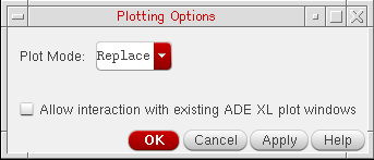 In the Sensitivity Analysis Results window, choose Options – Plotting. The Plotting Options form is displayed. In this form, the Plot Mode field specifies the plotting mode of the graph. By default, the default plotting mode is set to Replace.