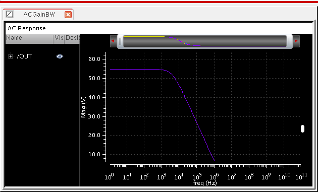 For example, when you plot an output, ACGainBW, from the ADE XL results tab, the graph appears as shown below.