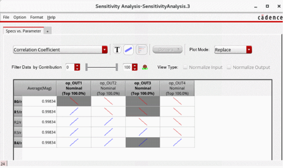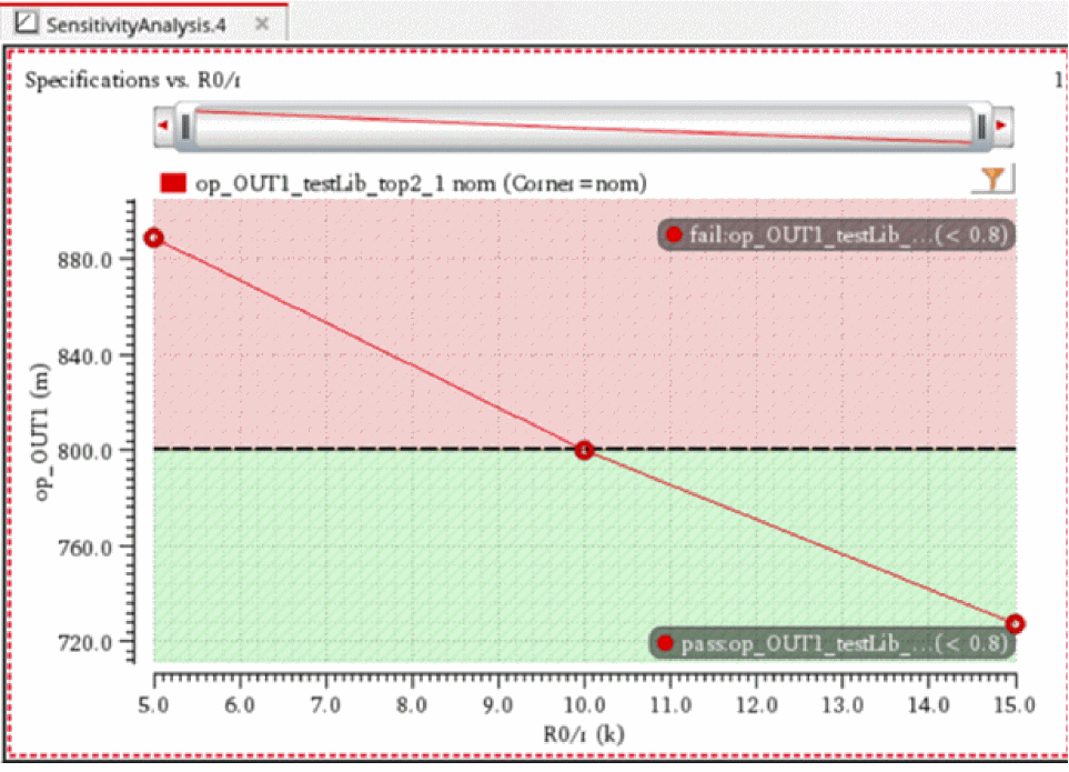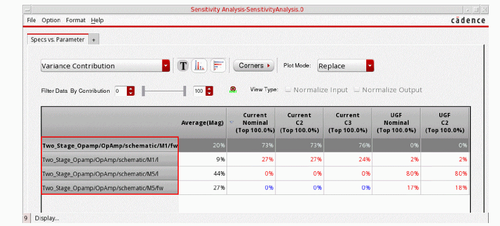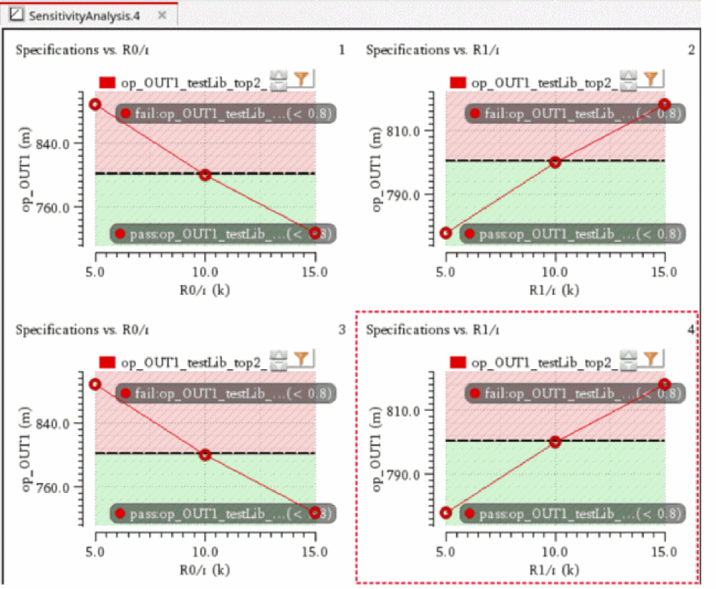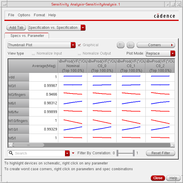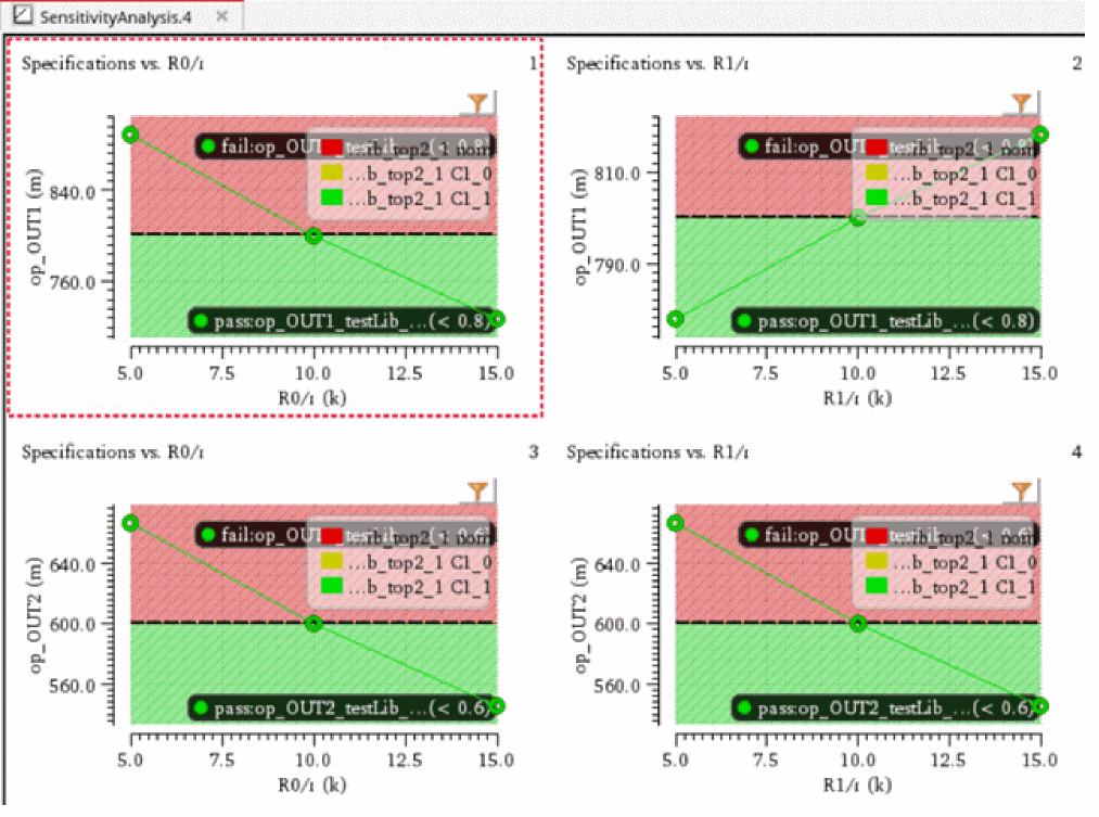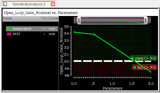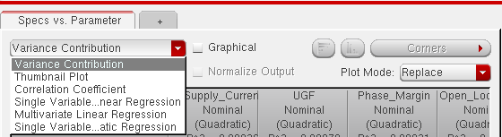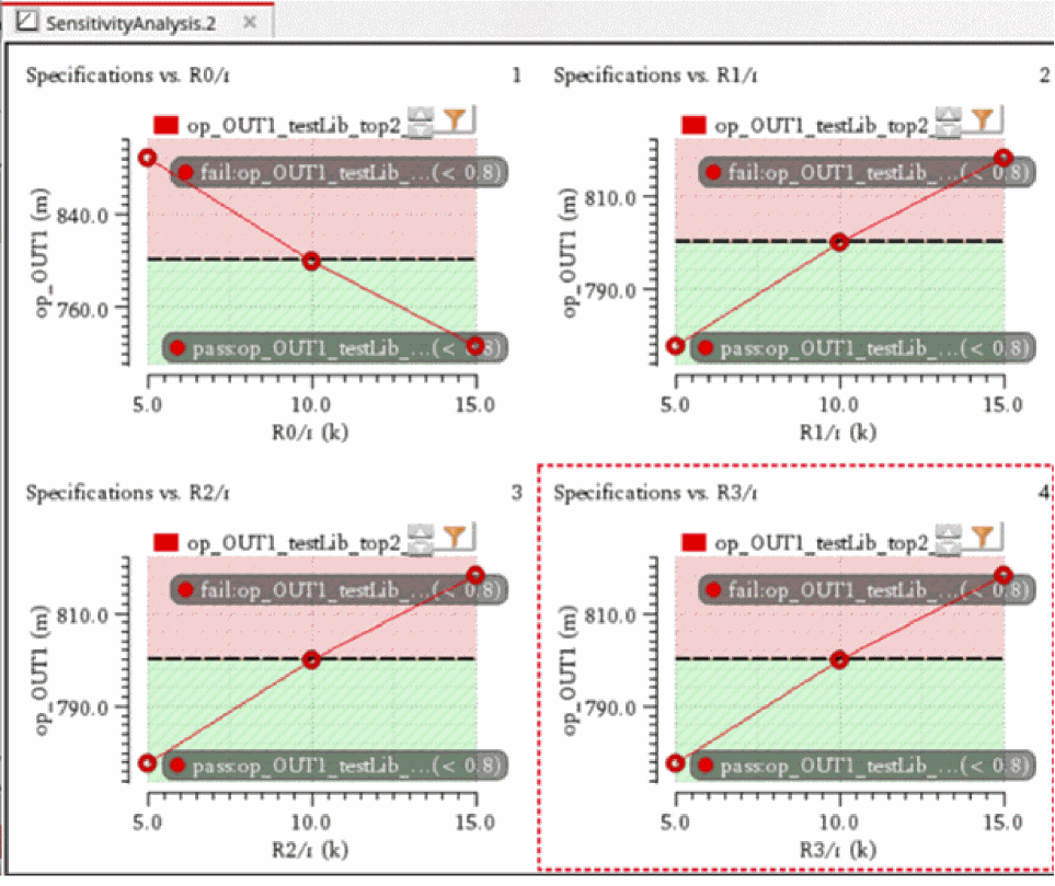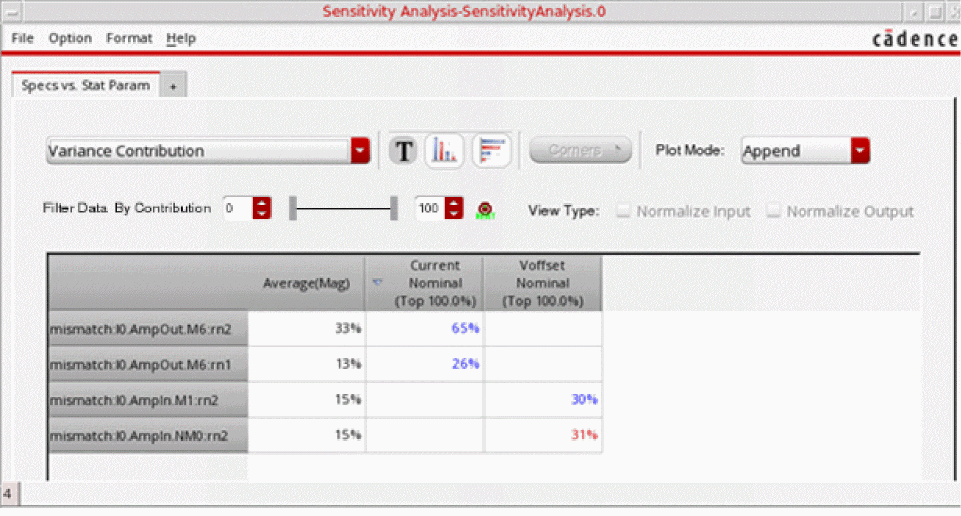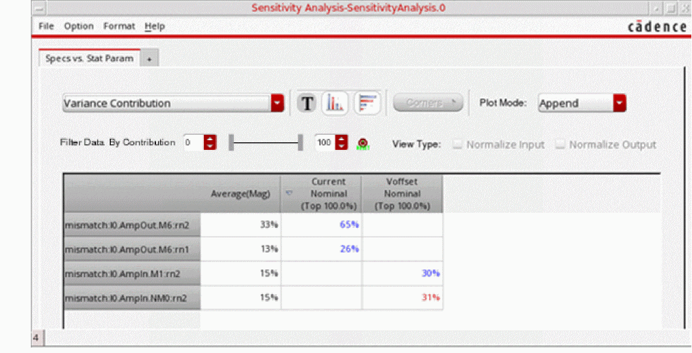 You can generate and view data on the sensitivity of specifications to variables, device parameters, statistical parameters and DC operating point parameters.