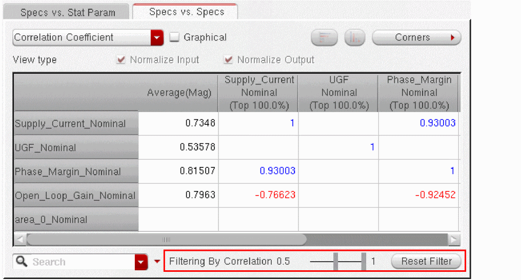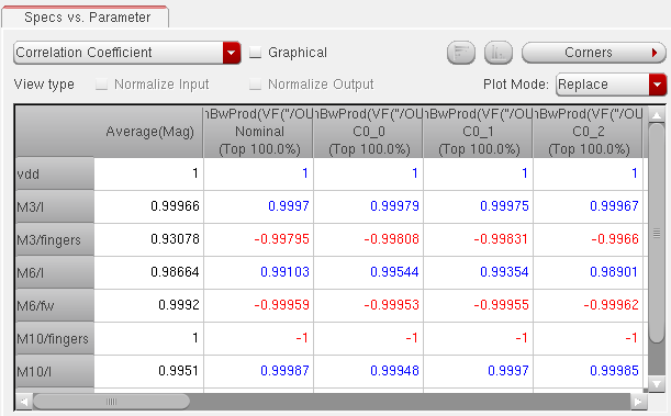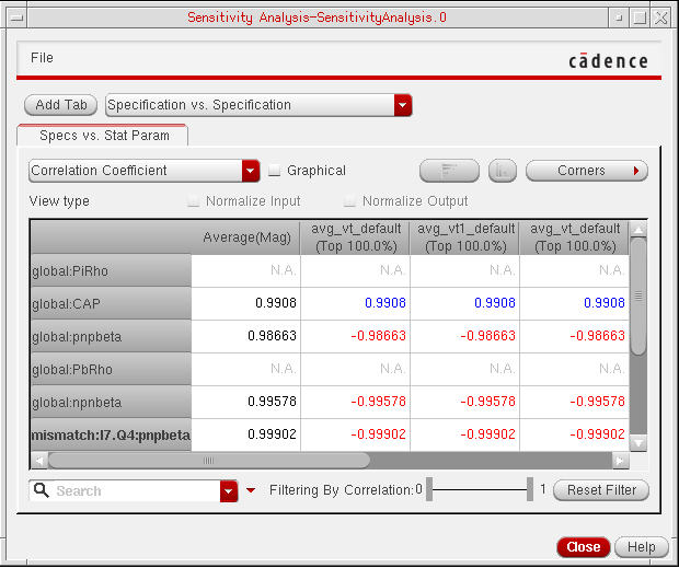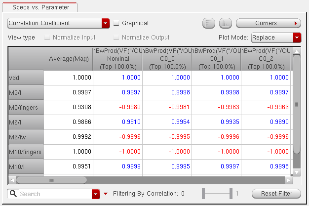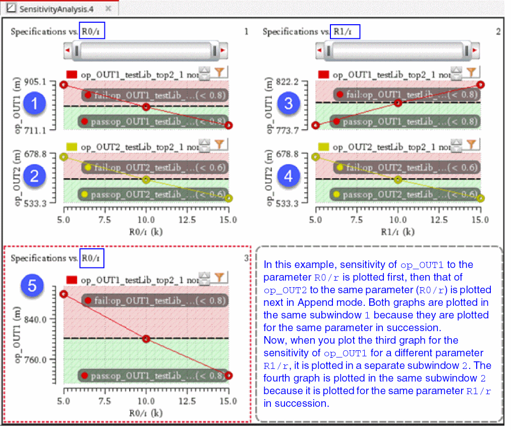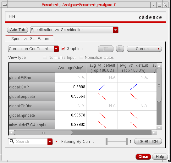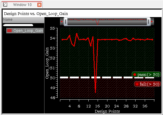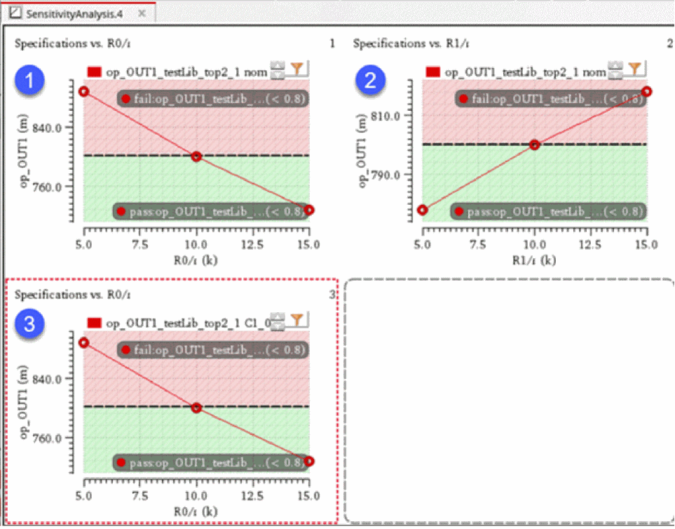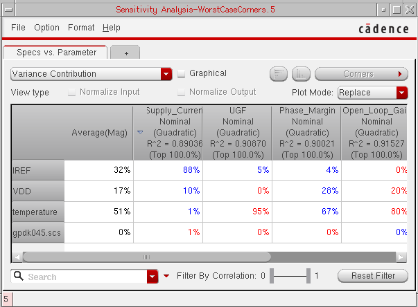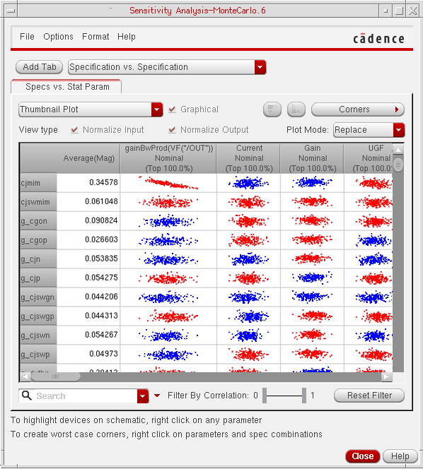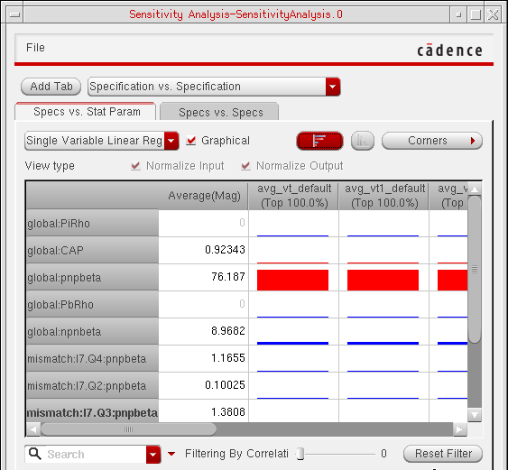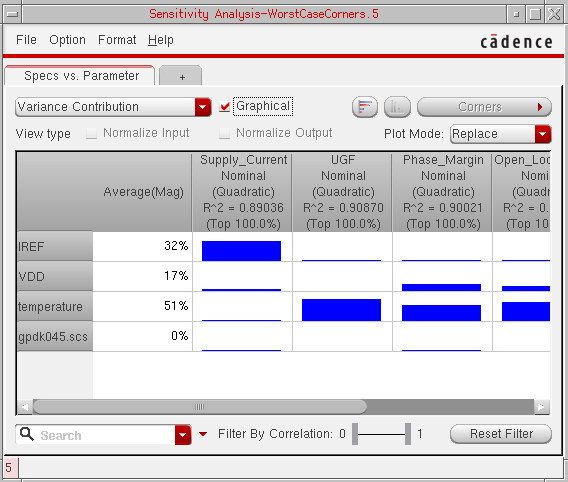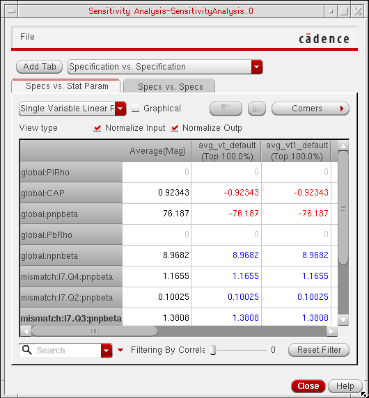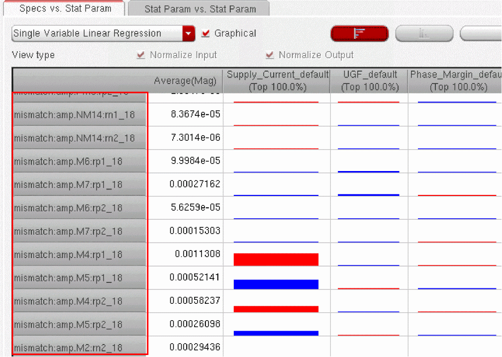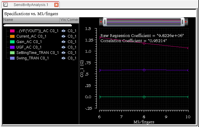 You can generate and view data on the sensitivity of specifications to variables, device parameters, statistical parameters and DC operating point parameters.