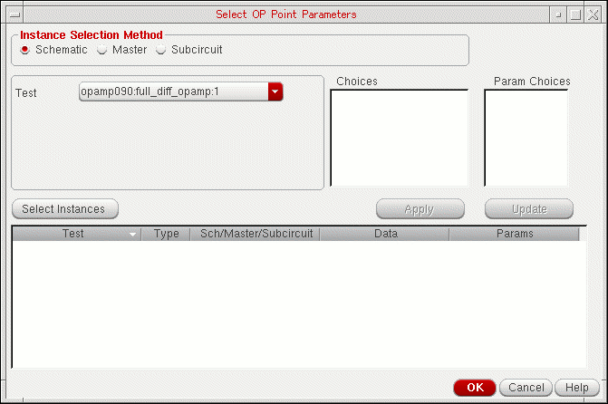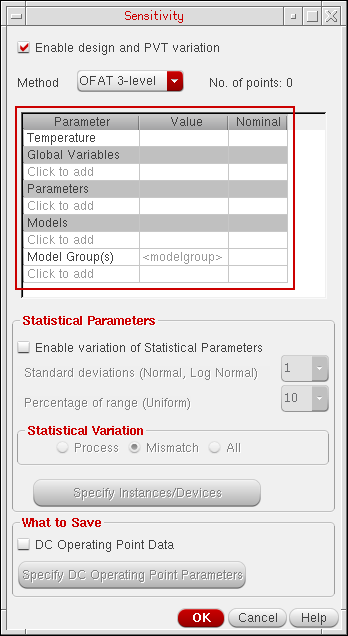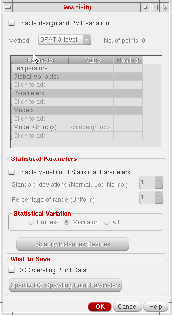 - Click the Specify DC Operating Point Parameters button to specify the DC operating point parameters for which you want to save and view sensitivity data. For more information, see Saving Sensitivity Data for DC Operating Point Parameters.