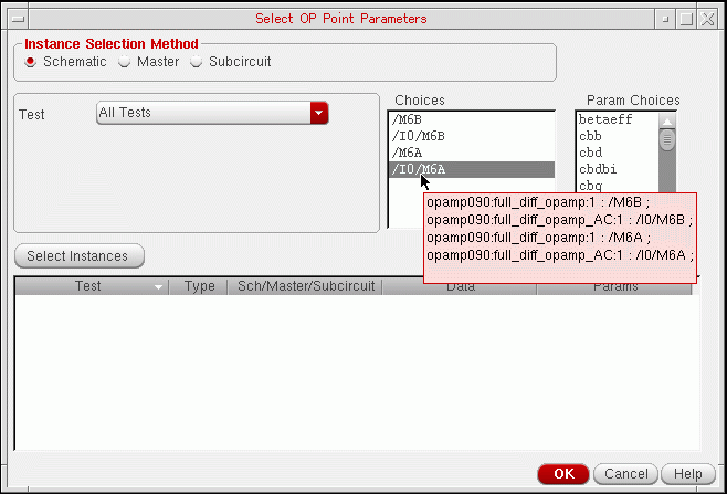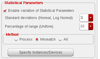 - (Optional) In step c above, if you select Mismatch or All, by default, the tool varies mismatch statistical parameters for all devices and instances in the design. Click Specify Instances/Devices to select specific instances and devices for which you want to analyze the impact of statistical variations. For more details, refer to Selecting Instances and Parameters for Mismatch Variation.