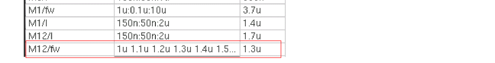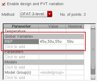 For example, if the variable range is 1u:0.1u:5u and the nominal value is 3.6u, the three values used by the tool are: 3.5u 3.6u, and 3.7u. - OFAT Sweep: Specify more than three values for a variable while varying one factor at a time. For example, if you specify the variable range as 200n:50n:400n, and the nominal value as 250n, the variable values used for simulation are: 200n, 250n, 300n, 350n, and 400n.