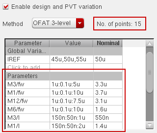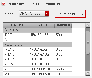 OFAT 3-level: Specify three values for a variable while varying one factor at a time. For example, 1.9u, 2.0u, 2.1u with nominal value equal to 2.0u. If, instead of three points, you specify a range of values, the tool chooses the following values of the variable for simulation: