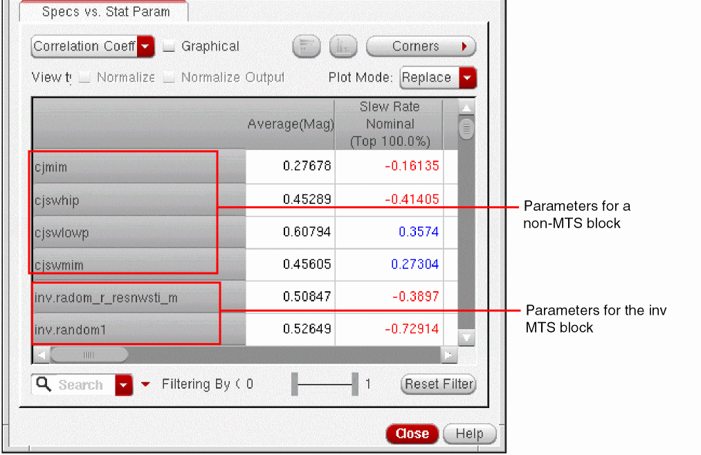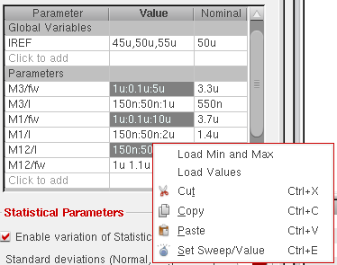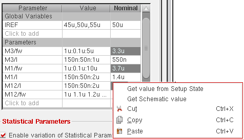 Statistical parameters are displayed in the Specs vs. Parameter tab and the DC Ops vs. Parameter tab if the Enable variation of Statistical Parameters check box is selected in the