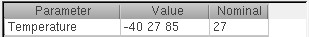 Alternatively, you can get the value of temperature from the test. For this, right-click the Nominal cell forTemperatureand choose Get Value from Test. This command copies the value of temperature from the test.If the value taken from the test does not exist in the Value cell, the tool automatically adds the nominal value to the existing values. For example, if you specify -40 and 85 as two values for temperature and get the nominal value from test, which is 27, the tool adds 27 to the value list.