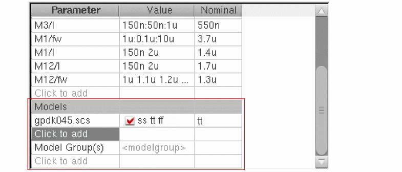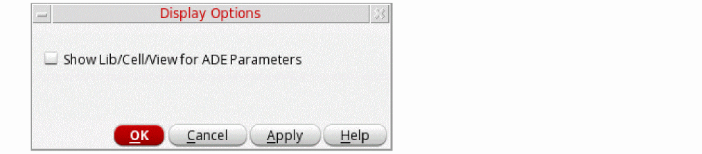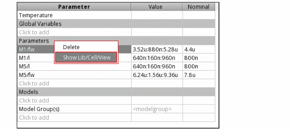 By default, only the names of the device parameters are displayed in the Parameters column of the Parameter table. To view the complete path (<Library>/<Cell>/<View>/<parameter_name>) to the device parameters, right-click either the Parameters header or the parameter name in the cell, and then select Show Lib/Cell/View.The complete paths to the device parameters are displayed in the Parameters column, as shown in the following figure.