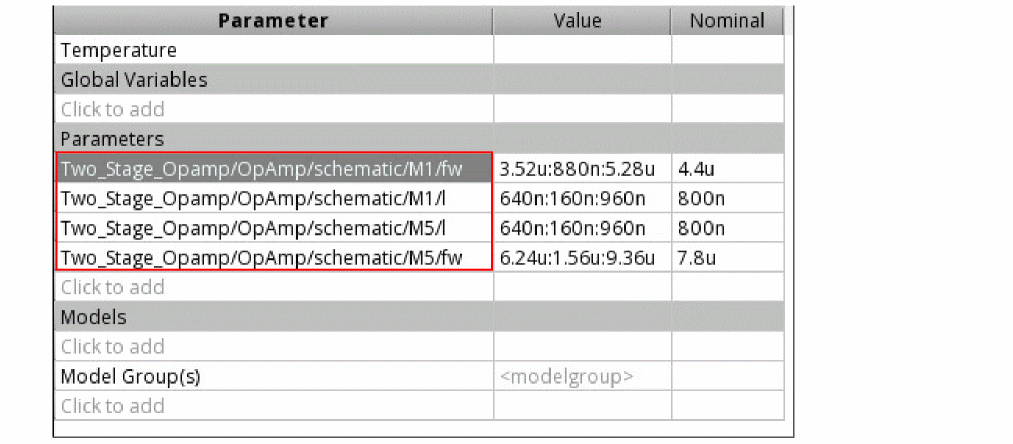 The tool reads the range of values and design value for the selected parameter from the Variables and Parameters assistant and displays it in the Value and the Nominal column, respectively, as shown below.