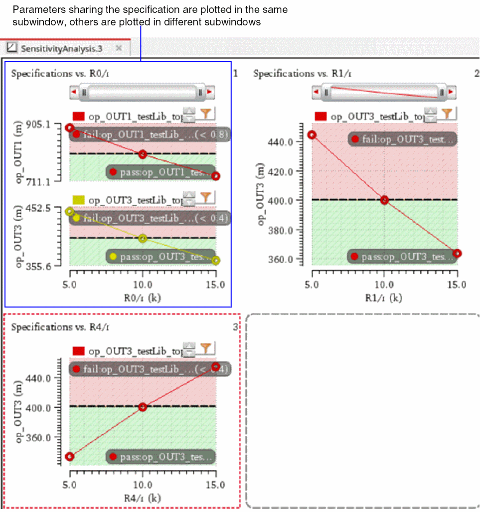 The specs vs. parameter graphs displayed from the Sensitivity Analysis window also show spec markers, as shown below.