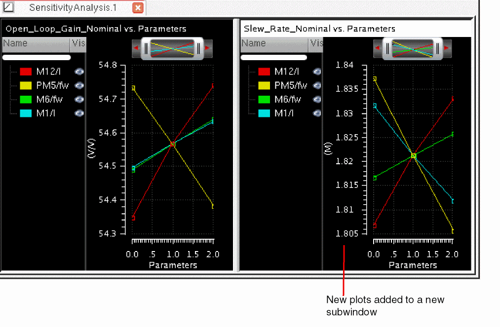 Now, if you want to plot the sensitivity results in a new subwindow of this graph to show sensitivity of UGF_ACGainBW to the variable M3/I, set the plotting options as shown below: