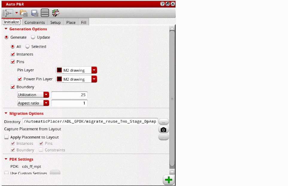 The Auto P&R assistant let you initialize, generate constraints, place, and fill the layout designs automatically, as per your requirements. Routing can be done through the Routing Assistant.