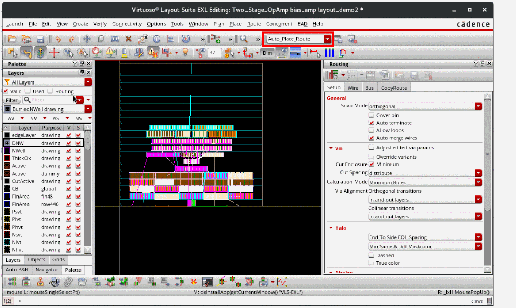 The following image shows the Auto_Place_Route workspace in Layout EXL: