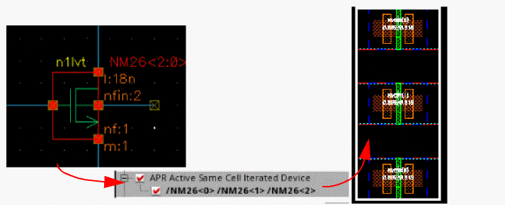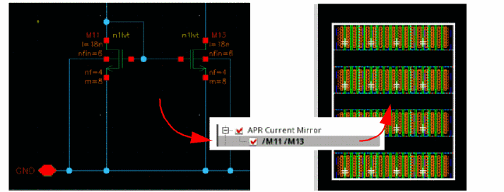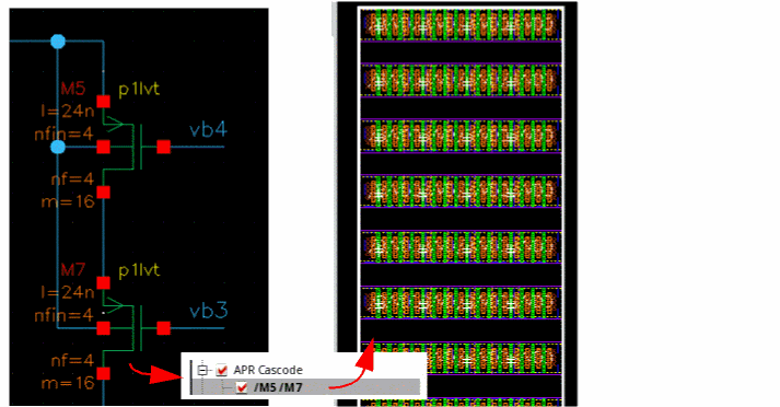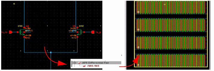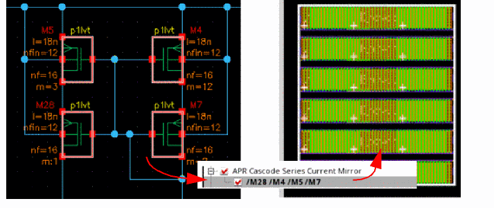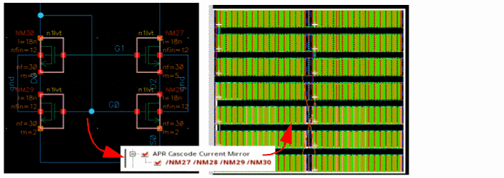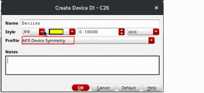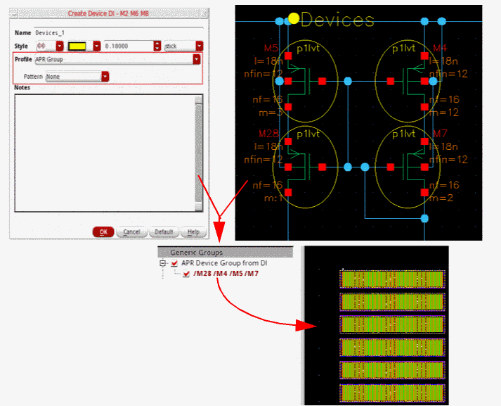 In the schematic cellview, a Design Intent (DI) can be created for devices that have their Profile set to APR Group. The APR Device Group from DI constraint finder recognizes such devices and places them in a group.