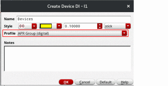 In the schematic cellview, a DI can be created for devices that have their Profile set to APR Group (digital).