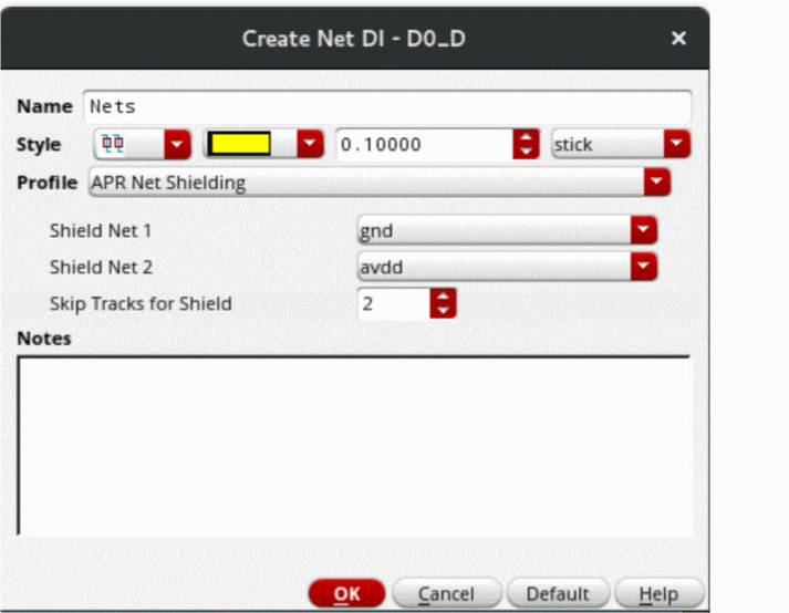 In the schematic cellview, a DI can be created for nets that have their Profile set to APR Net Shielding. This DI supports only parallel shielding, which comprises a shielding wire on the left and right side of the selected net.
