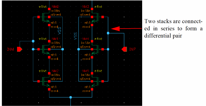 Groups devices when there are more than one stacks connected in series forming a differential pair structure.