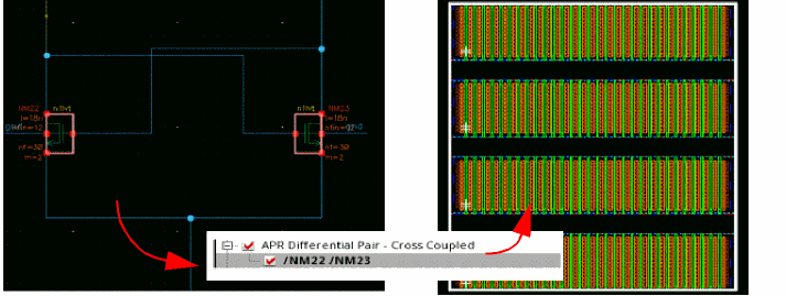 The APR Net Symmetry from DI constraint finder in the Auto P&R assistant recognizes the nets on which net symmetry design intents are defined in the schematic. These devices are grouped.