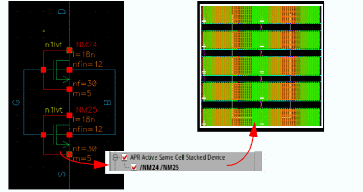 The APR Custom Digital Device Group from DI constraint finder in the Auto P&R assistant recognizes such devices and places them in a group as complimentary pairs (P and N chained devices).