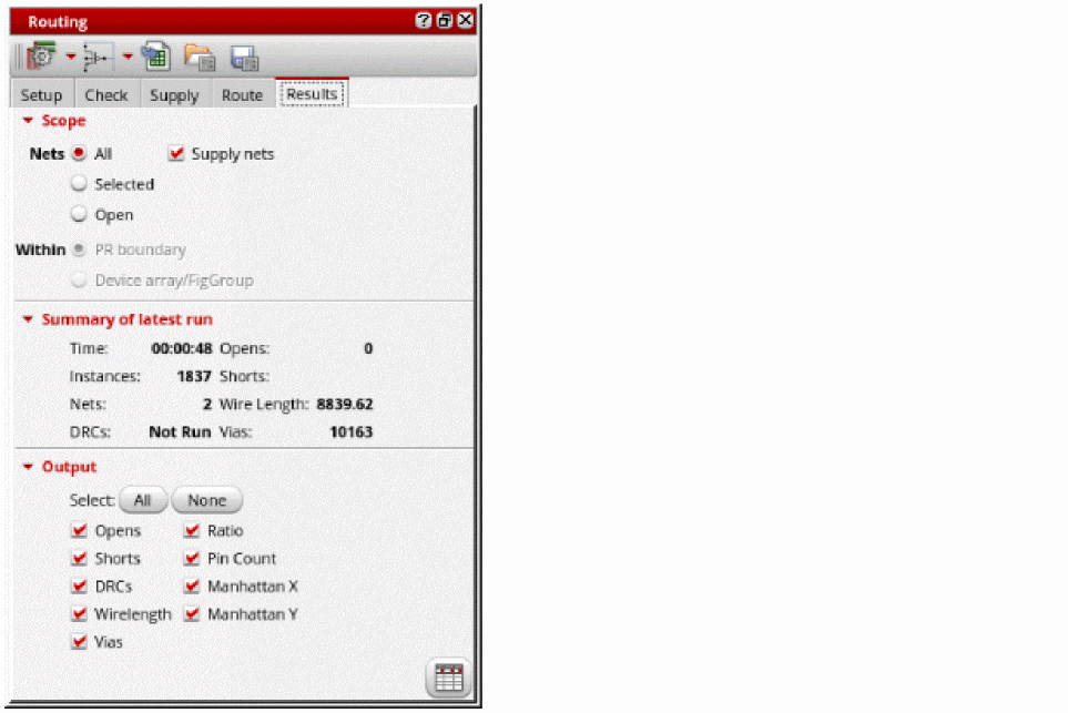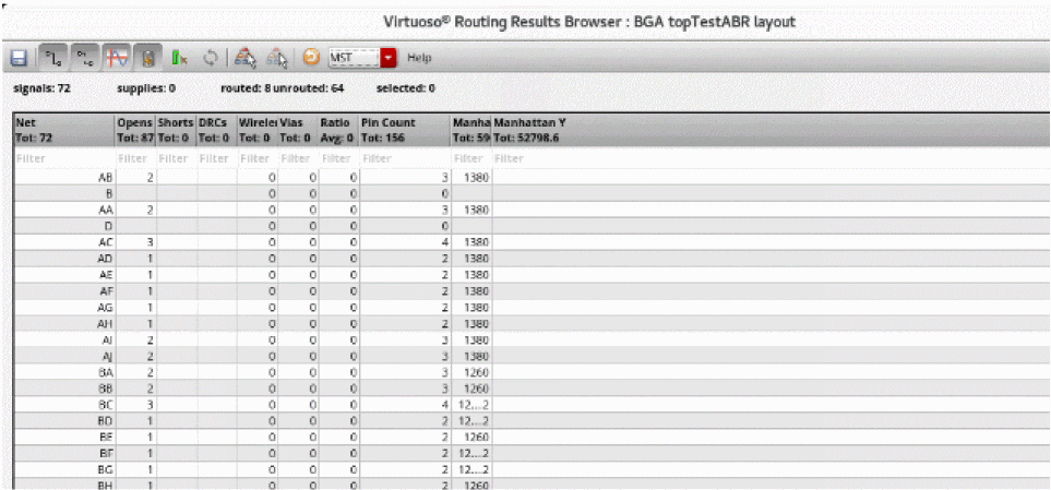 The Routing Results Browser includes a table that displays routing results, for example the number of opens, shorts, wire length, DRC, and vias. Use this table to analyze the routing results,