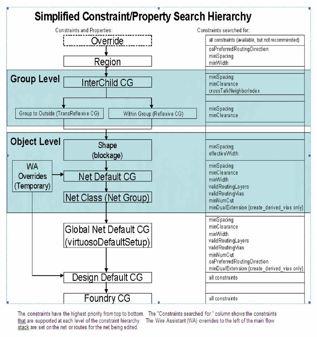 The constraints search hierarchy determines the order and which constraints the router looks at. Additionally, the interactive router can assign overrides for the net which is currently being edited which overrides the value of the constraint for any constraints set on that net. The constraint search hierarchy diagram is as shown below.
