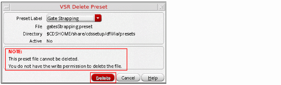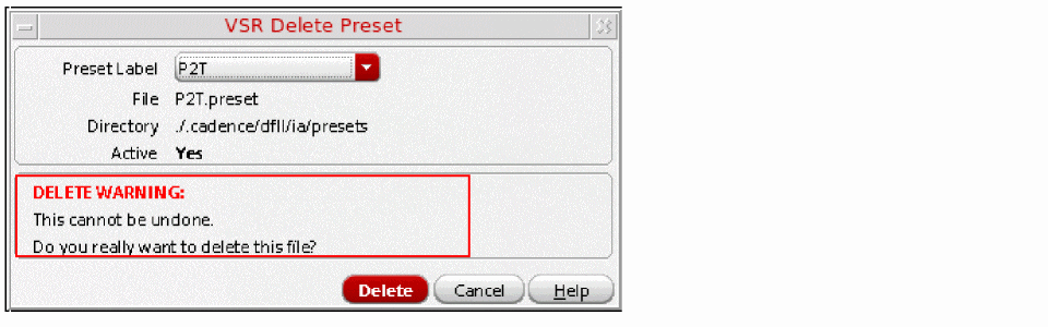DisplaysYesif the selected preset file is the one that was loaded last; otherwise, displaysNo.You can only delete a preset file for which the value in the Active field isYes. A warning message is displayed stating that a deleted preset file cannot be restored in the current Virtuoso session.However, if you do not have the appropriate permissions to delete the selected preset file, the value in the Active field is shown as