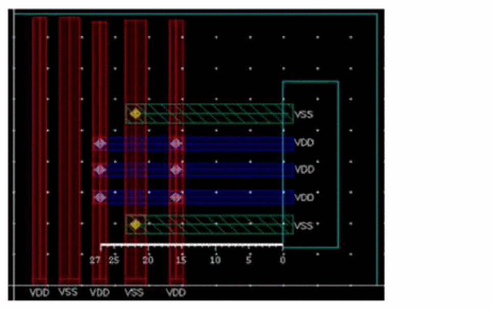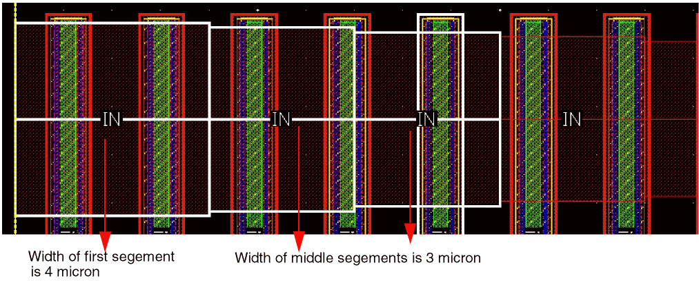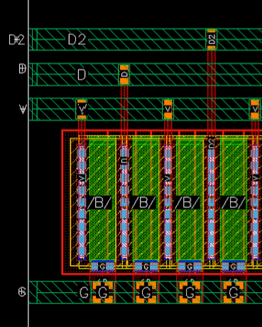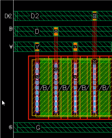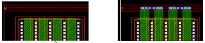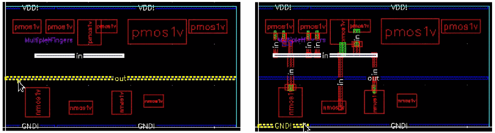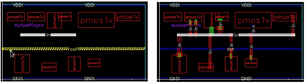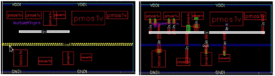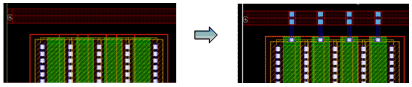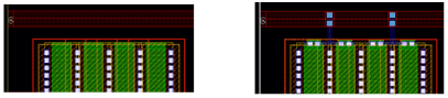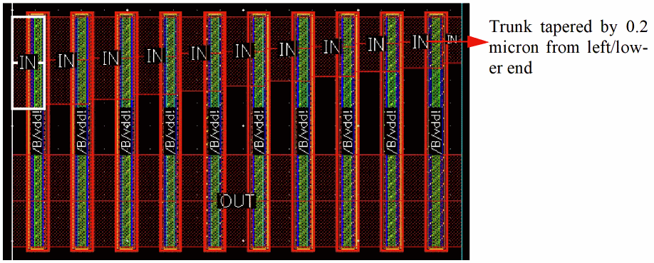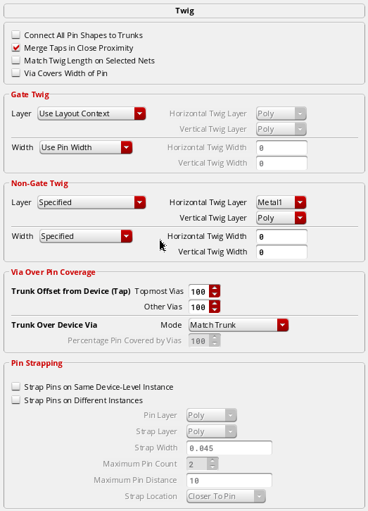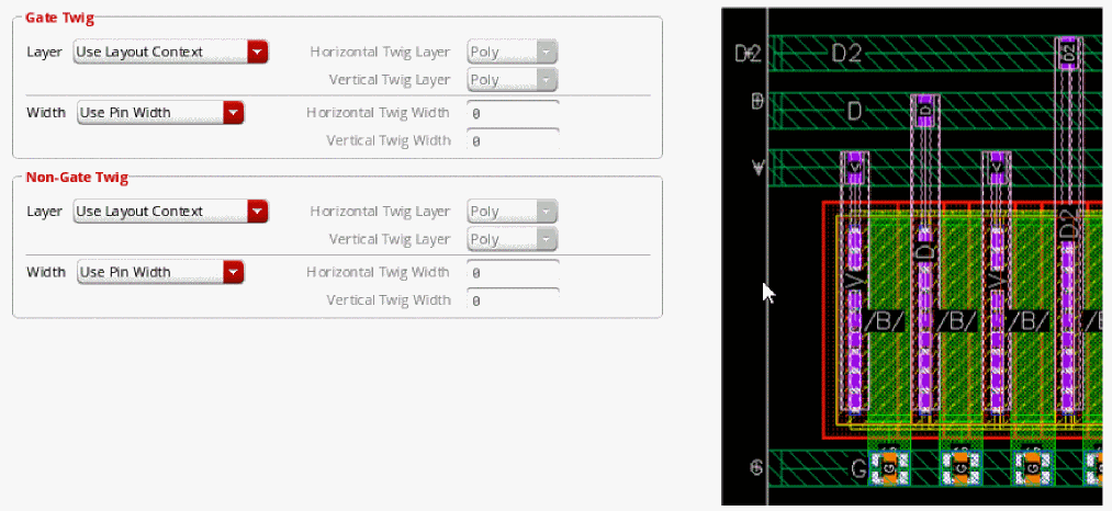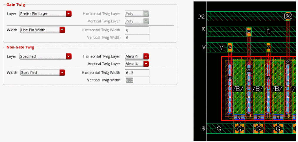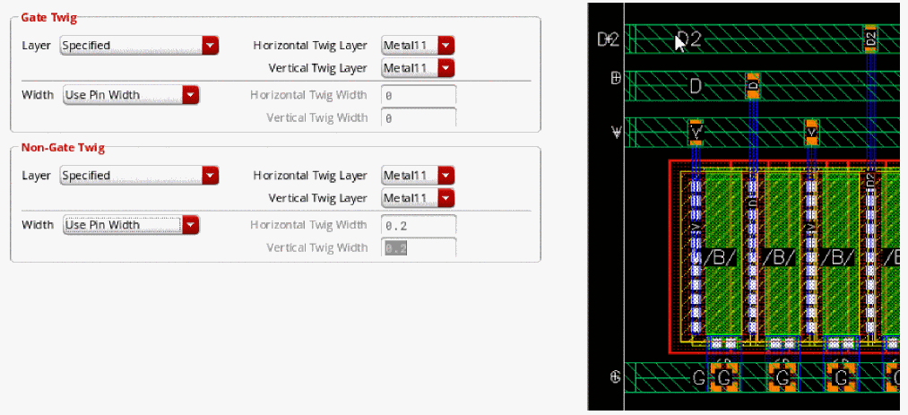 Example 3: The following figure shows an example where the layer for gate and non-gate twigs is selected as Metal1 and the width of the gate and non-gate twigs is set equal to the width of the pin.
