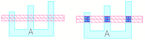 Controls the percentage of source and drain pin coverage with via stacks except for the top layer, when the trunk is entirely over the device. In the following example, you can see that net A has the trunk over the device and the selected mode is Match Trunk. Therefore, lower vias cover 100 percent of the trunk width.