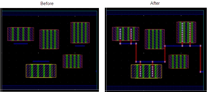 The router straps the gate, source, and drain pins of the same instance and same net together before making a connection to the trunk.