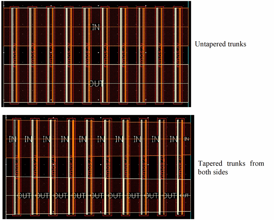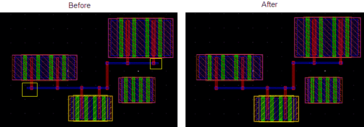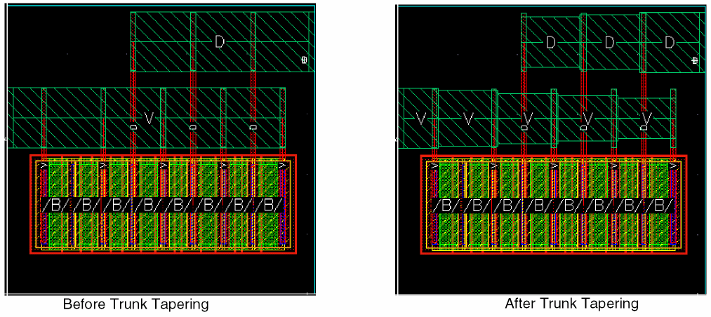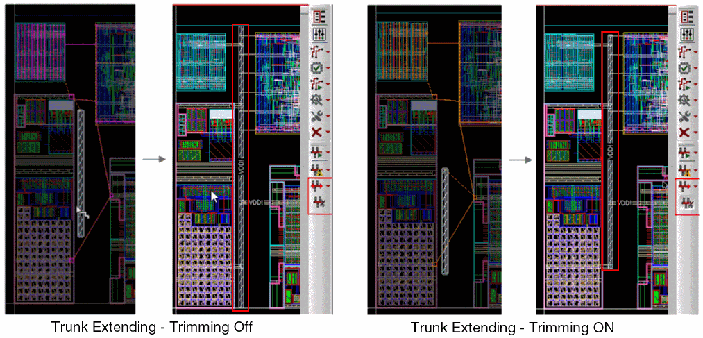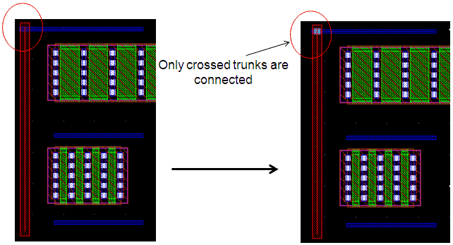 In this routing step, both ends of a trunk are trimmed while routing when the Trunk Trimming routing step is enabled. However, when the Trunk Trimming routing step is disabled, the length of the trunks is preserved. By default, the Trunk Trimming routing step is enabled. The following figure shows routing when Trunk Trimming is disabled and when it is enabled.