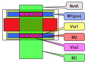 Covers the entire trunk on the top via layer and covers the entire pin on the lower via layers. -