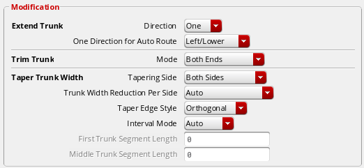 The trunk tapering routing step lets you taper the trunks depending on the options that have been specified in the Taper Trunk Width section of the Modification group box in the Trunk subform. For more information, see Specifying Trunk Options.