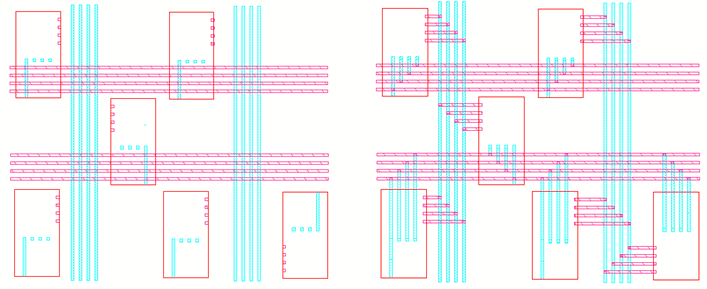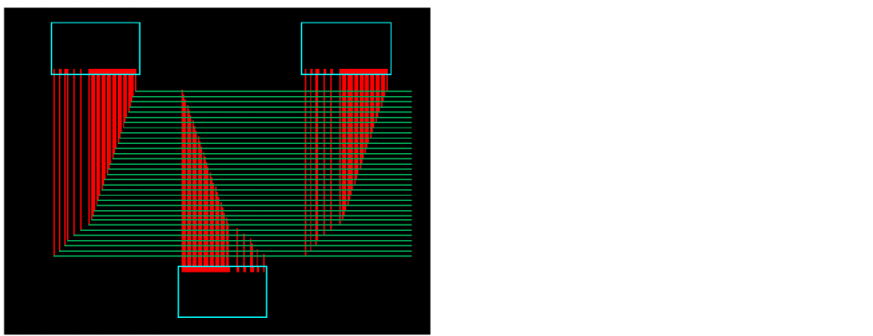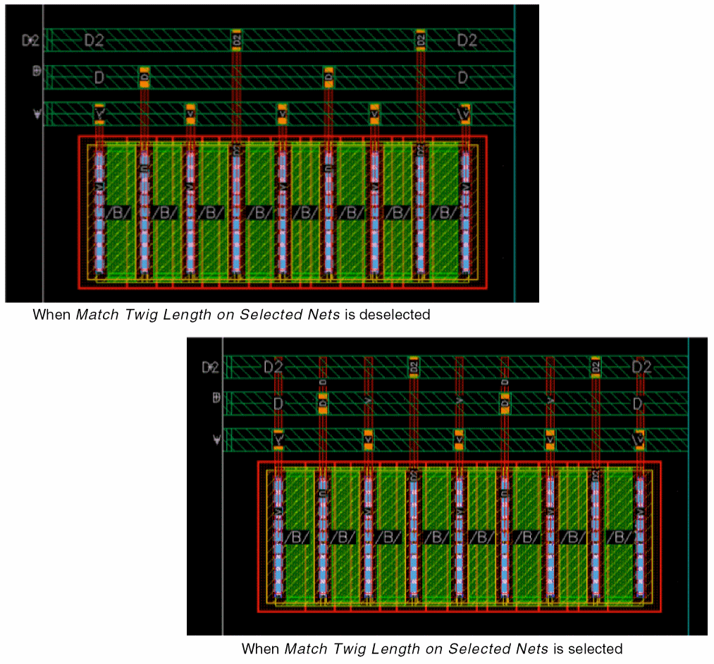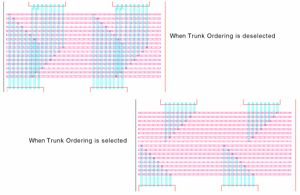 When this routing step is selected, the router optimizes the total routing length by re-ordering trunks not connected to a pin or another trunk. The trunks with more open twigs on the top are placed closer to the top end while the trunks with more open twigs on the bottom are placed closer to the bottom end. The trunks that have different widths retain the original width after their order is modified. The following figure shows the optimized trunk ordering when the Trunk Ordering routing step is deselected as well as selected.