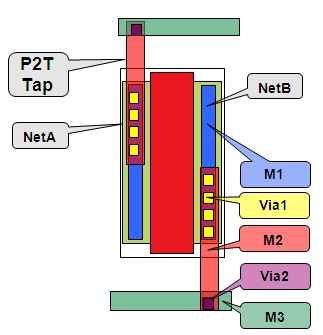 Specifies the percentage of a pin shape to be covered by a trunk tap when a trunk is not over a device. This reduces the parasitic capacitance effect across source and drain pins. In the following example, you can see that net NetB is routed with M2 covering the M1 pin shape and the intersecting area is flooded with vias. The percentage specified to be covered by a trunk tap is (45, 45). The percentage is specified in the Topmost Vias and Other Vias cyclic field.