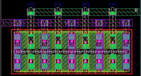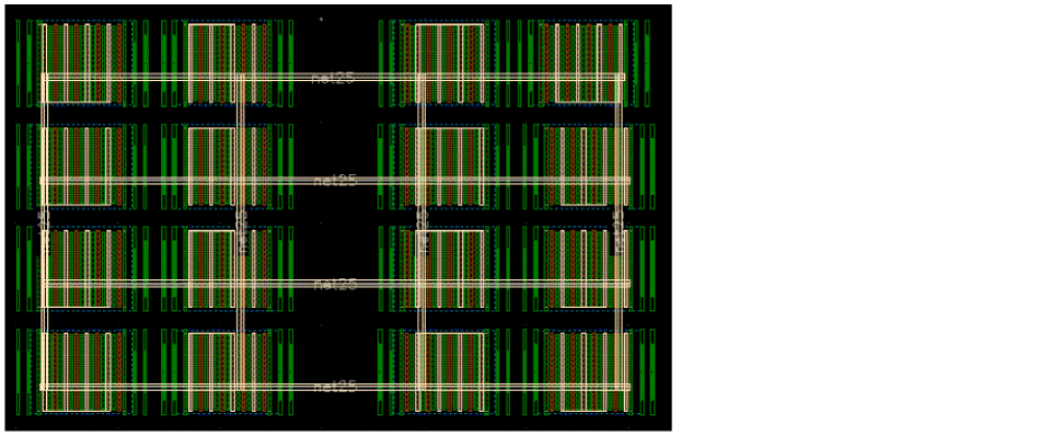 The default value of Mode is Auto, which means that the Finish Trunk command selects only the pins that are in the same channel as the trunks. To allow the Finish Trunk command to connect the pins that are not in the same channel as the trunk, select either the Space or All option from the Mode drop-down list. The following figure shows a layout design on which the Finish Trunk command was run successfully with Mode set to All.