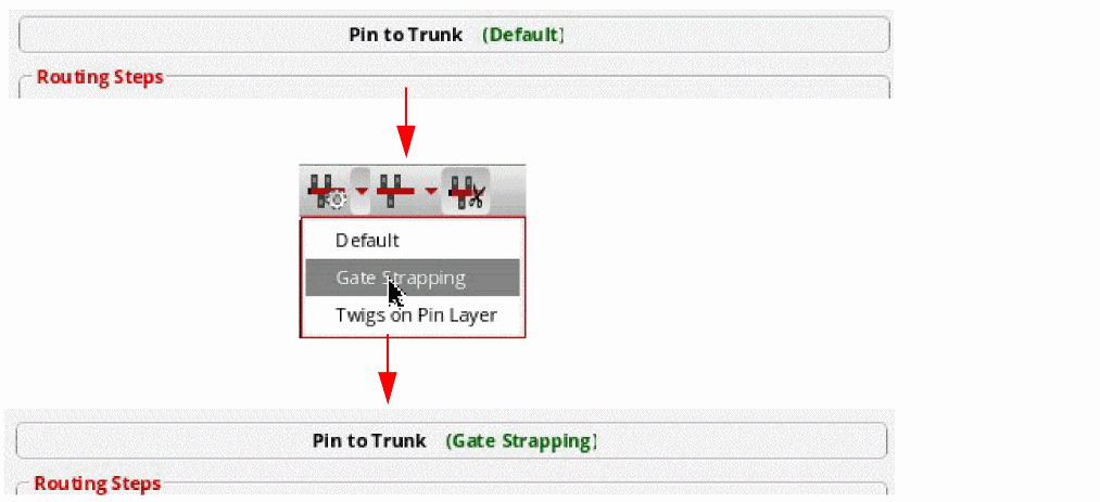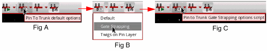 For example, the Pin to Trunk Options Preset Scripts icon in Fig A shows the default action. The Fig B displays the selection of the Gate Strapping options preset script. In Fig C, the tooltip of the icon changes from Pin to Trunk default options to Pin to Trunk Gate Strapping options script.