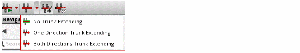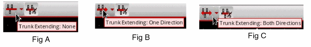 The behavior of the Extend Trunks icon is based on the last action of one of the following: No trunk Extending, One Direction Trunk Extending, or Both Directions Trunk Extending. By default, the trunk extension is set to None and the associated icon is displayed on the toolbar, as shown in Fig A. However, when you click the One Direction Trunk Extending menu item, the selected trunk is extended in one direction and the toolbar icon changes to Extend Trunks: One Direction, as shown in Fig B. Similarly, the toolbar icon changes to Extend Trunks: Both Directions when the Both Directions Trunk Extending menu item is selected, as shown in Fig C. The tooltip on the icon informs you of the last action that was performed for trunk extension.