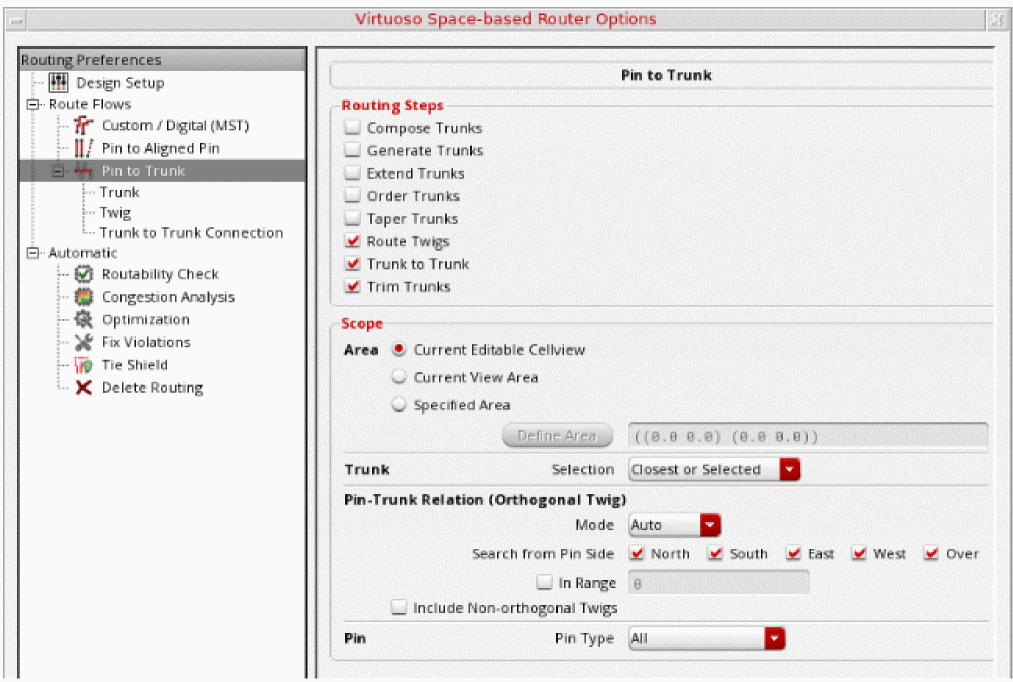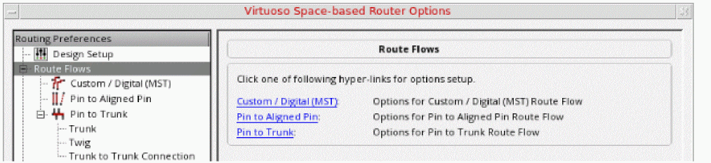 Click Options to view in the Virtuoso Space-based Router Options form all the choices related to the Pin to Trunk routing style that is currently set. You can then select any of the option from the Pin to Trunk tree to set up specific settings. -