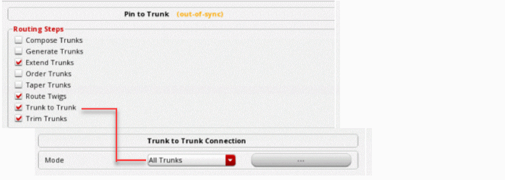 The Trunks Trimming icon turns on or off the Trunk Trimming step in the Pin to Trunk subform. By default, the Trunk Trimming step is ON. The functionality of this icon is the same as the Trunk Trimming step in the Routing Steps group box of the Pin to Trunk subform.