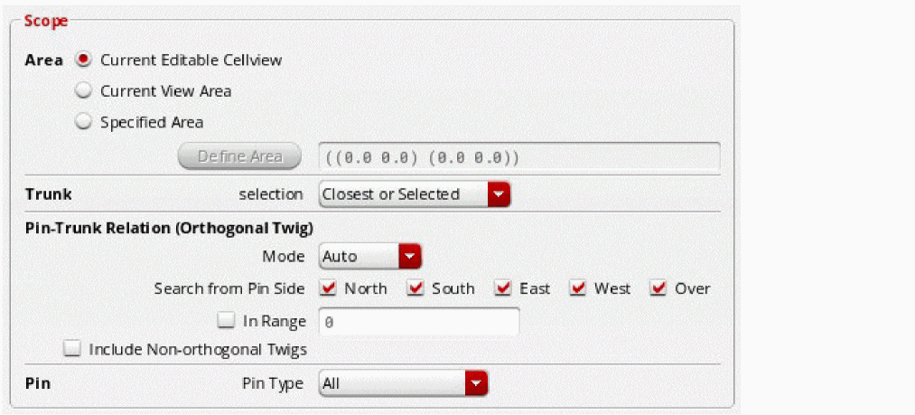The functionality of this option is the same as the Current Editable Cellview radio button in the Scope group box of the Pin to Trunk (Default) subform in the Virtuoso Space-based Router Options form. For more information, see Current Editable Cellview. -