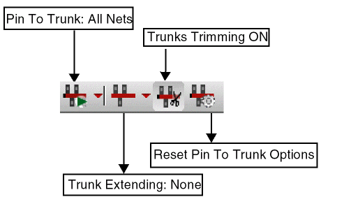 The Pin To Trunk toolbar is not available by default in the layout window. To display the toolbar, choose Window – Toolbars – Pin To Trunk. You can use this toolbar to access the options for Pin to Trunk routing shown below.