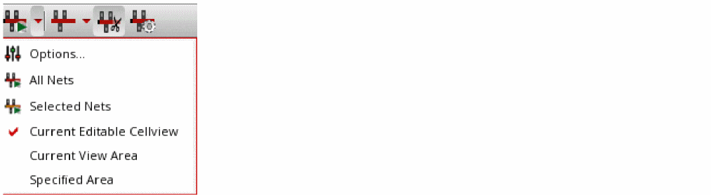 The Pin to Trunk icon lets you set up the routing scope and run the Pin to Trunk command on the specified routing scope either on all the nets or selected nets. Click the arrow next to the icon to view the Pin to Trunk routing scope options available on the drop-down menu associated with the icon.