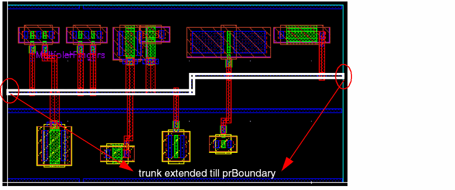Click Both Directions Trunk Extending to extend the trunk in both the directions until the trunk touches the PR boundary or is at a point that is at the minimum spacing away from an obstruction on the same layer. Both ends of a trunk are extended. The functionality of this option is the same as the Both option selected from the Direction drop-down list in the Extend Trunk section of the Modification group box of the Trunk subform. For more information, see Extend Trunk.