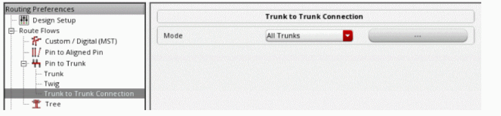 Lets you customize the way meshes are routed. When you click the ellipses button next to the Mode field, the Trunk Mesh Routing Configuration form displays. This form displays a table of layer settings and a set of options that you can use to specify the way each layer is to be routed in the mesh. For more information on the options, see Trunk Mesh Routing Configuration Form (ICADVM18.1 EXL Only).