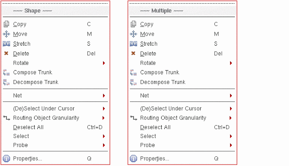 The Compose Trunks and Decompose Trunks commands are available in VLS XL in the Edit – Wiring menu. You can also access these commands from the Shape and Multiple context-sensitive menus that display if you right-click in the design display area after selecting one or more objects.