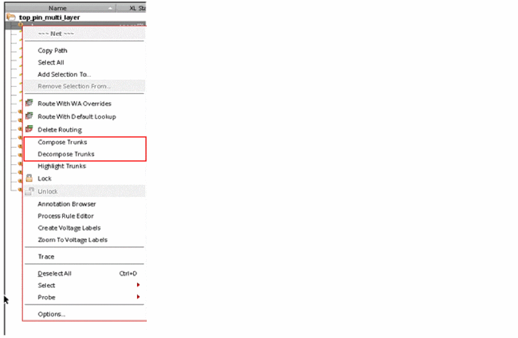 Alternatively, you can access the Compose Trunks and Decompose Trunks commands from the Navigator context-sensitive menu. The context-sensitive menu is displayed when you right-click the net after selecting it in the Navigator Assistant.