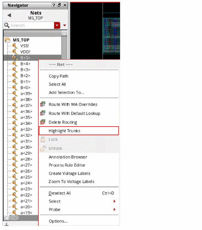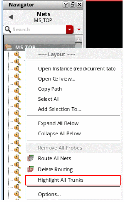 To highlight trunks for all the nets that have a valid composed trunk in a cellview, right-click the cell and choose Highlight All Trunks from the context-sensitive menu.