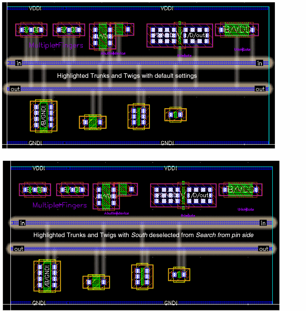 Trunks and twigs that are legal and can be recognized by the router are highlighted.The following figure shows an example where the trunks and twigs are highlighted when the Current Editable Cellview option is selected and in the Search from Pin Side, South is deselected.