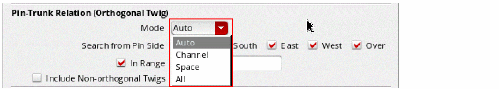 To determine which pins should be connected, the Finish Trunk command uses the value selected in the Mode field in the Pin-Trunk Relation (Orthogonal Twig) section in the Scope group box of the Pin to Trunk (Default) subform.