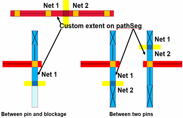 minEndOfLineSpacingviolation. In this case, the router modifies the pathSeg and extends it (custom extent) until it comes into contact with trim and bridge shapes. A patch shape is not added.