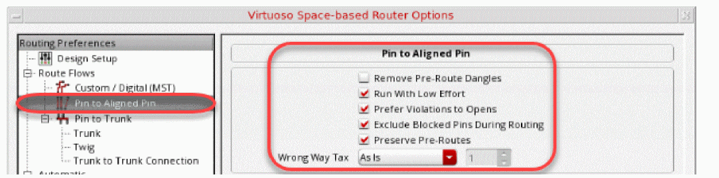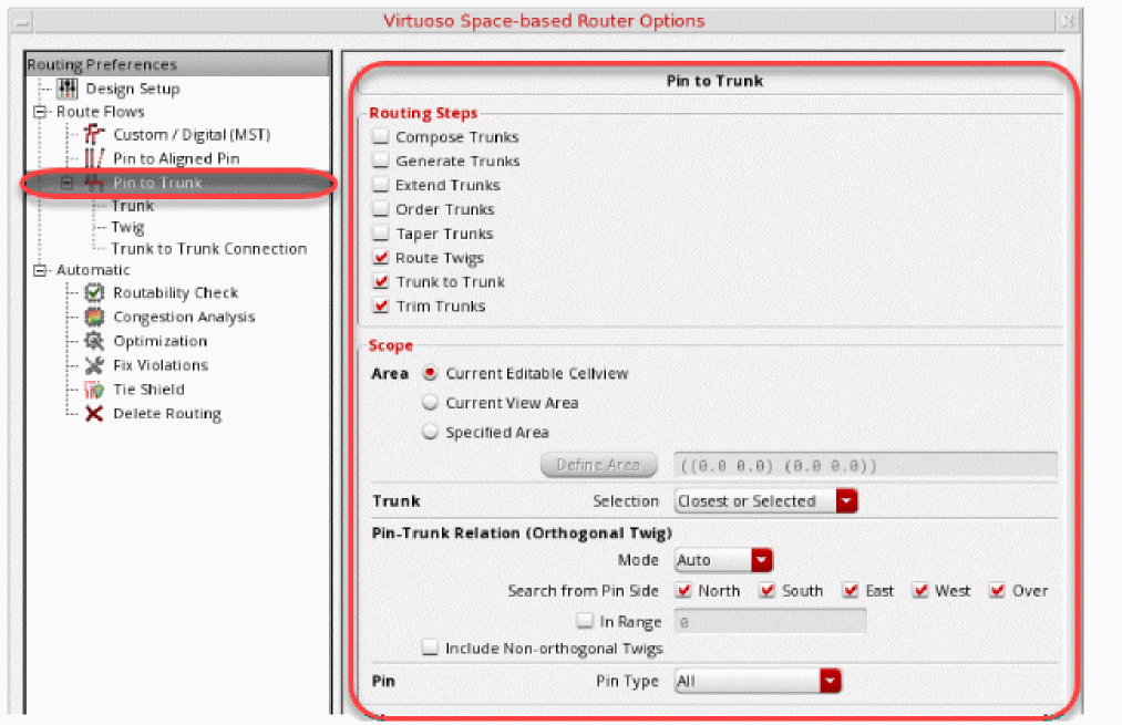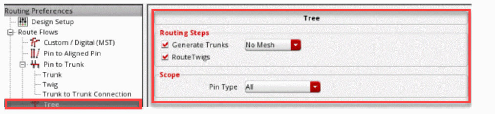 - Pin to Trunk router routes the nets with trunks according to the options specified in the Pin to Trunk subform. For more information about the Pin to Trunk options, see Using the Pin to Trunk Routing